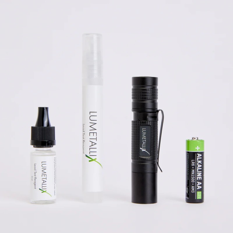 Le kit d’origine comprend la solution de test Lumetallix et la LeadLight nécessaire à la lecture du résultat.