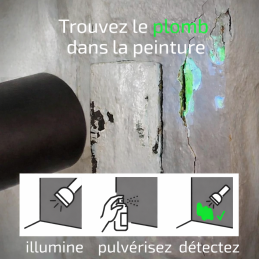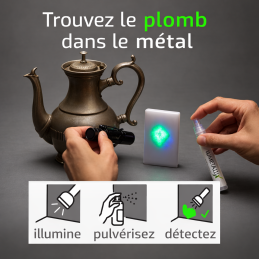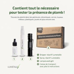 Détectez rapidement la présence de plomb sur peinture, métal, verre, céramique, plastique, jouets, tuyaux et autres supports grâce au kit complet Lumetallix. Lecture fluorescente verte sous UV, utilisation simple et plus de 400 tests par kit